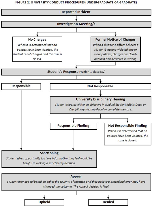 The specific procedure the student must follow depends on the type of allegation. There are essentially three types of procedures: University Level Student Conduct Procedures, Major Level Student Conduct Procedures, and Title IX Procedures.
